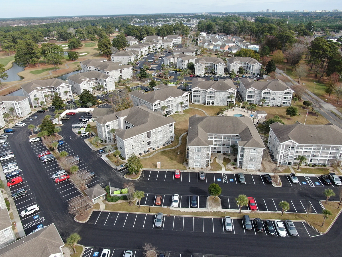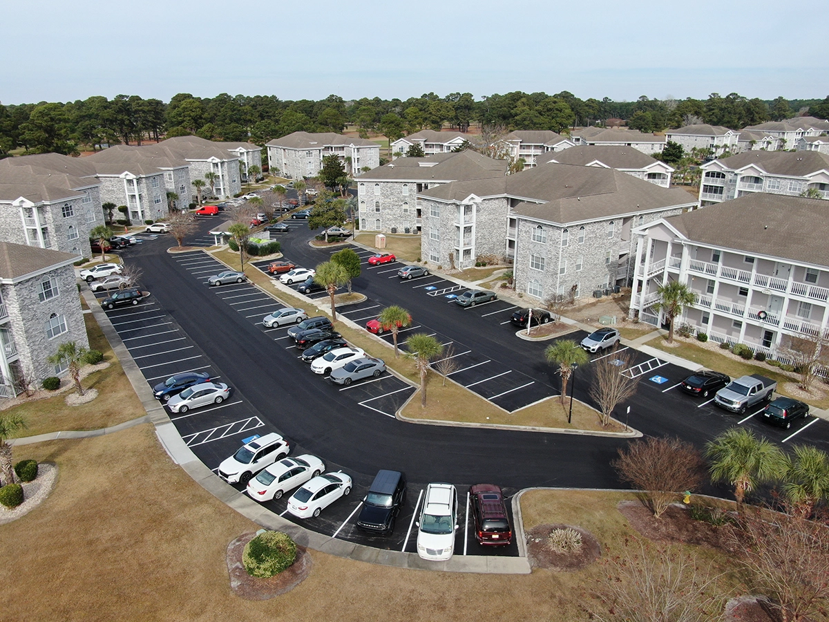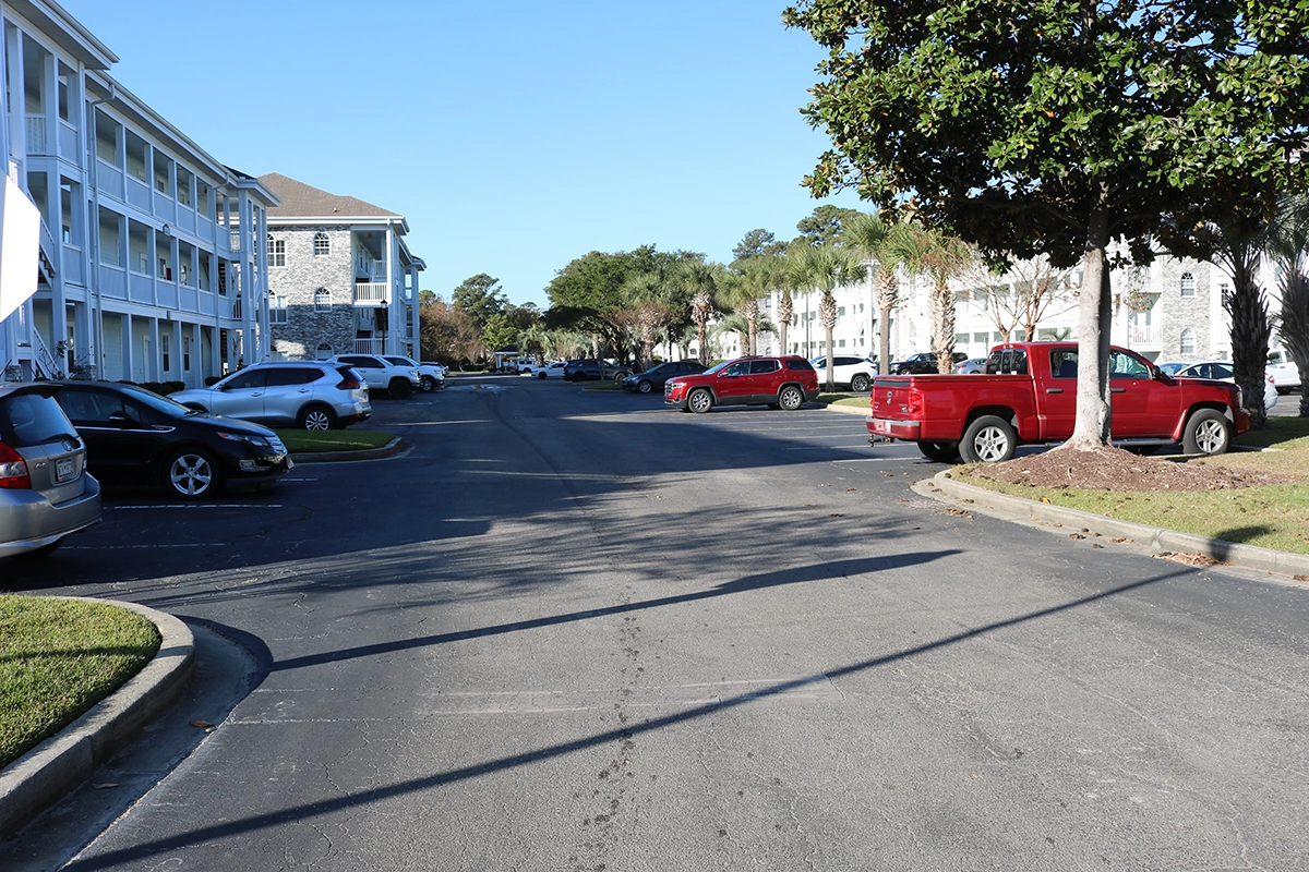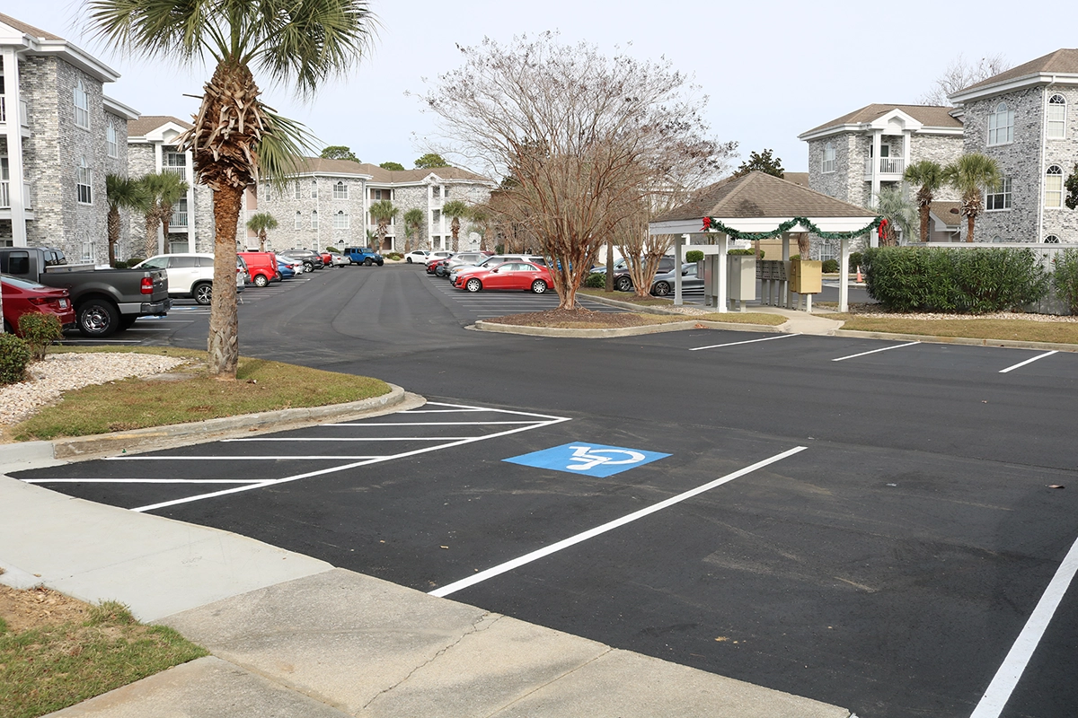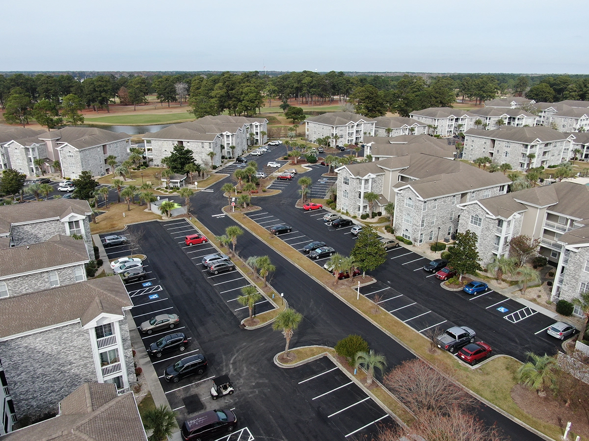 We were able to showcase our total in-house capabilities as a self-performing, full-service contractor on this large condo-style HOA in the Carolina Forest area of Myrtle Beach. With such a significant investment to repave the entire parking lot, we advised the client to take the necessary steps to ensure their investment would last. After conducting core reports and a stormwater assessment of the community’s underground utility system, our team identified multiple areas requiring excavation and stormwater pipe replacement and spot repairs of existing utilities showing damage. While it can be time intensive, proper planning prevents sinkholes and prematurely damaged asphalt. Once stormwater repairs were complete, our concrete crew arrived to repair curbing and sidewalk throughout the community and install 45 (!) ADA-compliant accessibility ramps, removing the existing asphalt ramps that jutted out into the parking areas. Finally, we spent three weeks repaving the entire community in two lifts for a 3” parking lot. This project was completed in the Fall when there was slightly less traffic throughout the HOA. The result – a safe, easily-accessible and beautiful community for residents to enjoy.