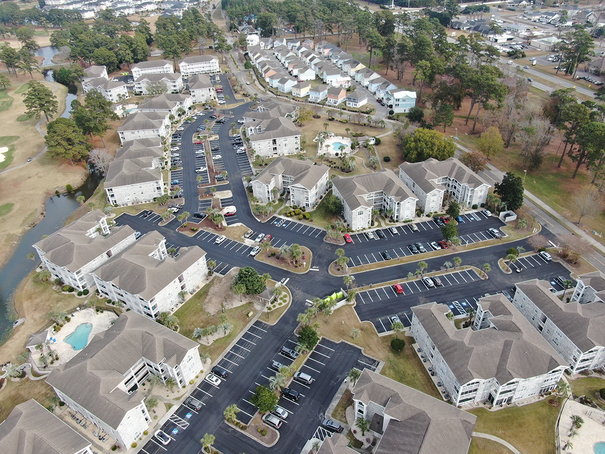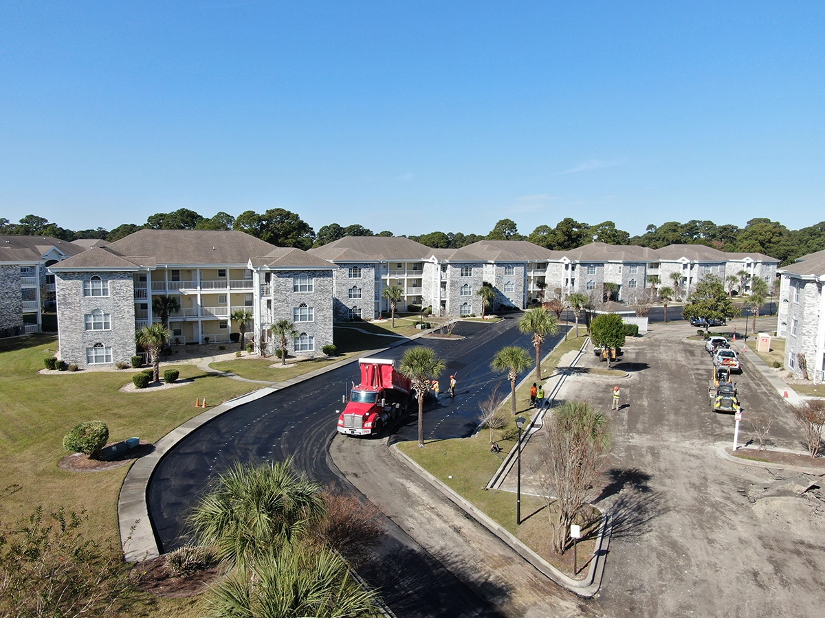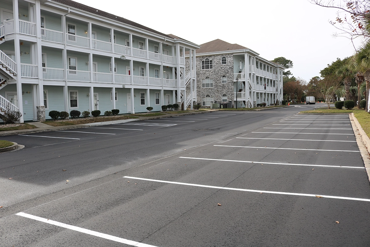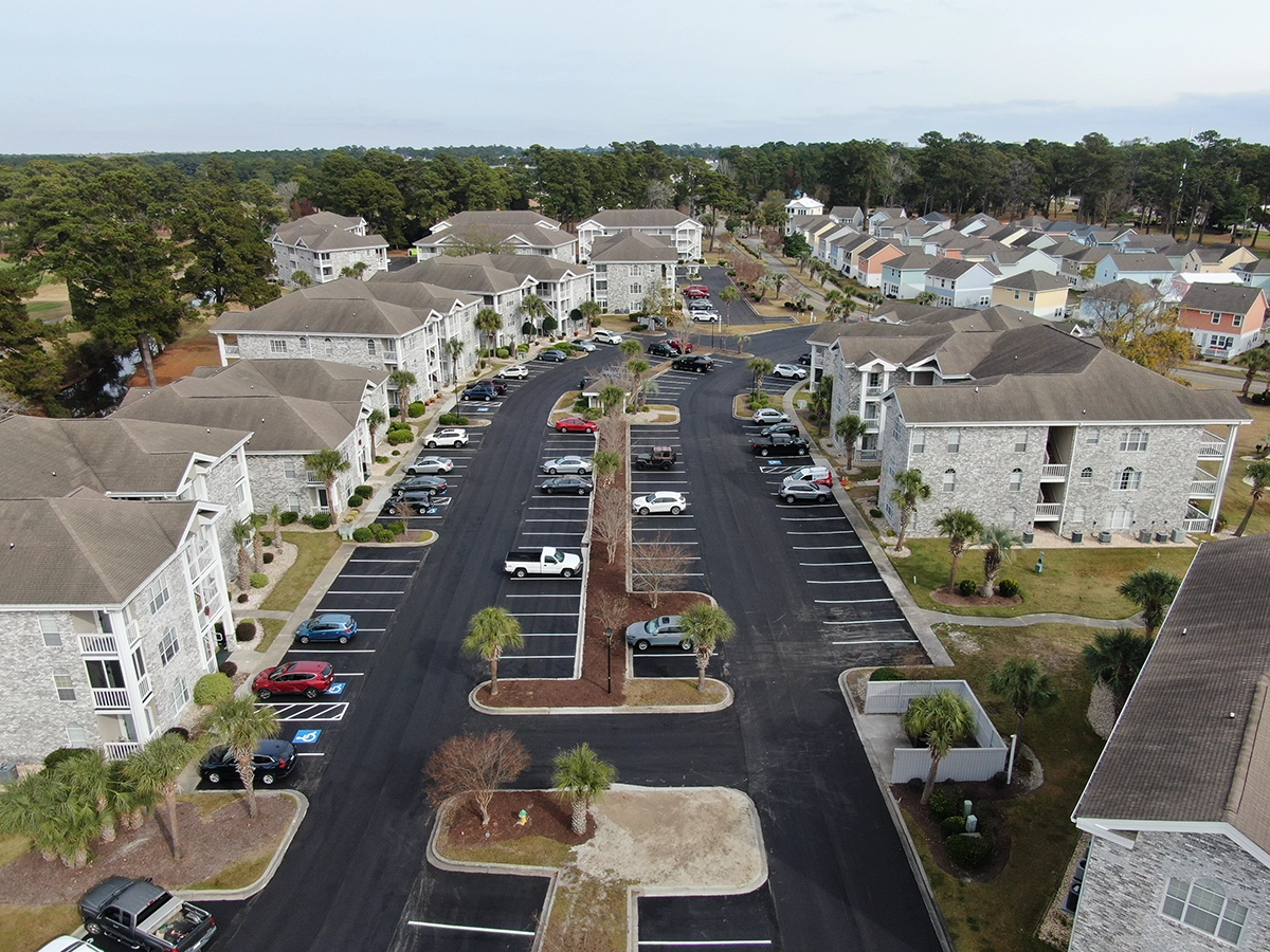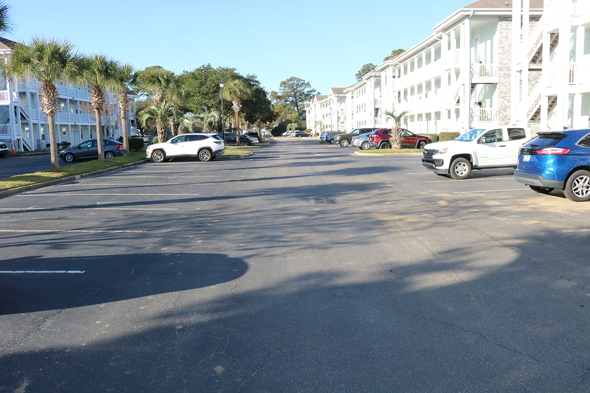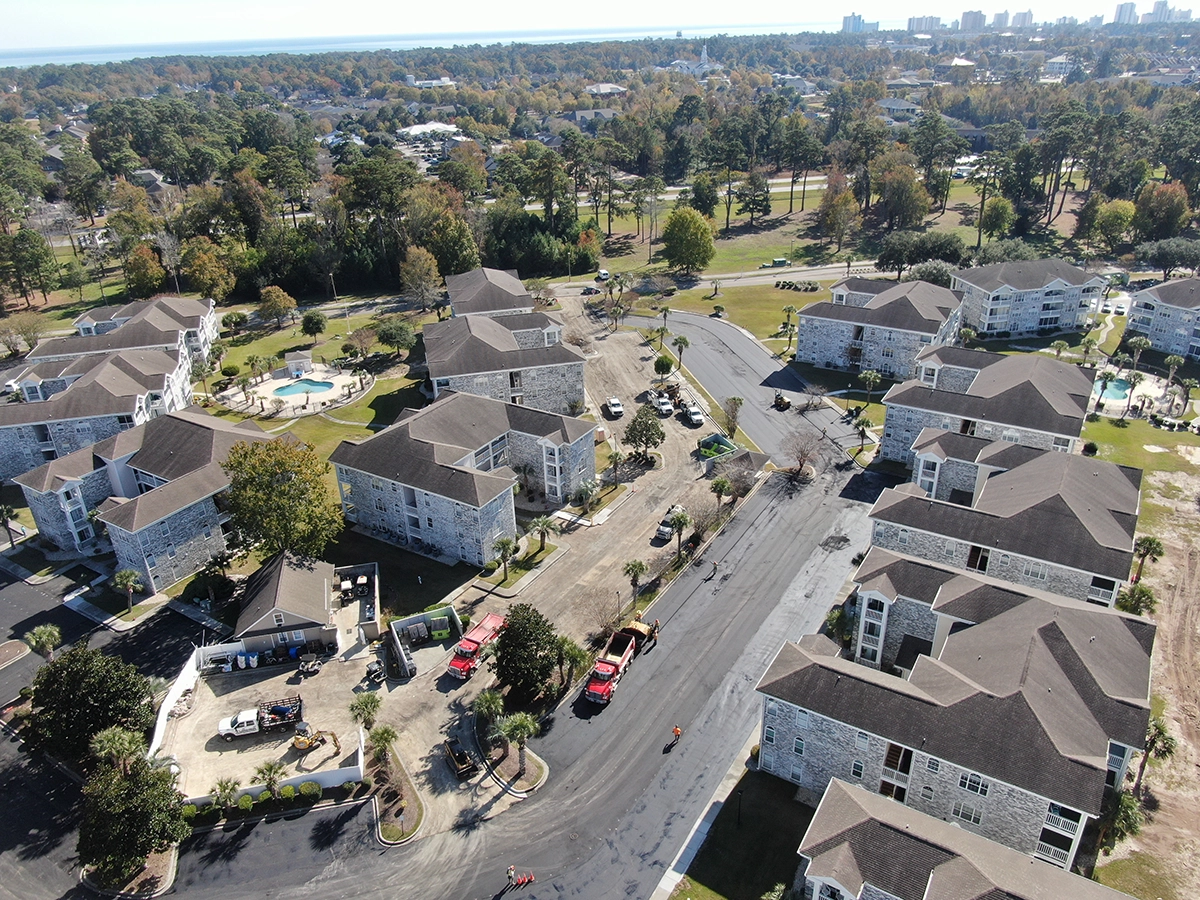 We were able to showcase our total in-house capabilities as a self-performing, full-service contractor on this large condo-style HOA in the Carolina Forest area of Myrtle Beach. With such a significant investment to repave the entire parking lot, we advised the client to take the necessary steps to ensure their investment would last. After conducting core reports and a stormwater assessment of the community’s underground utility system, our team identified multiple areas requiring excavation and stormwater pipe replacement and spot repairs of existing utilities showing damage. While it can be time intensive, proper planning prevents sinkholes and prematurely damaged asphalt. Once stormwater repairs were complete, our concrete crew arrived to repair curbing and sidewalk throughout the community and install 45 (!) ADA-compliant accessibility ramps, removing the existing asphalt ramps that jutted out into the parking areas. Finally, we spent three weeks repaving the entire community in two lifts for a 3” parking lot. This project was completed in the Fall when there was slightly less traffic throughout the HOA. The result – a safe, easily-accessible and beautiful community for residents to enjoy.