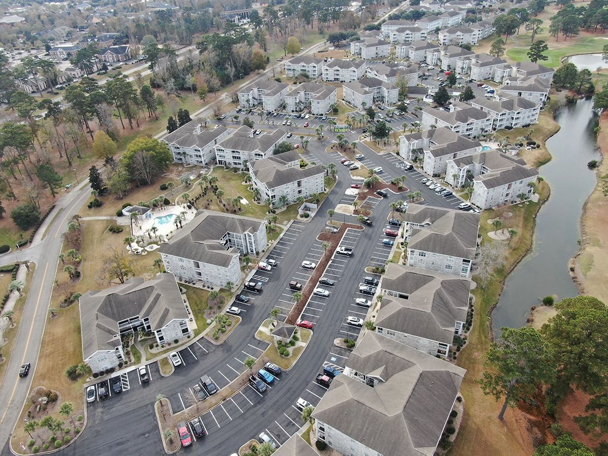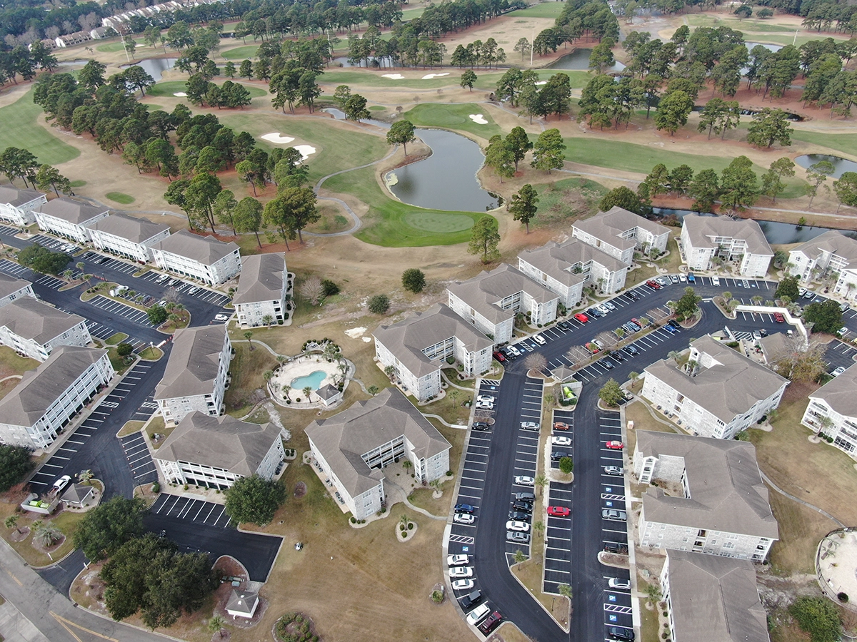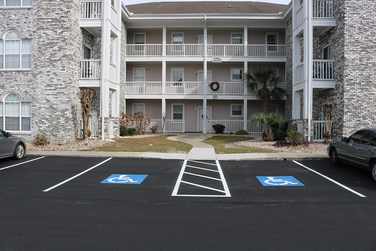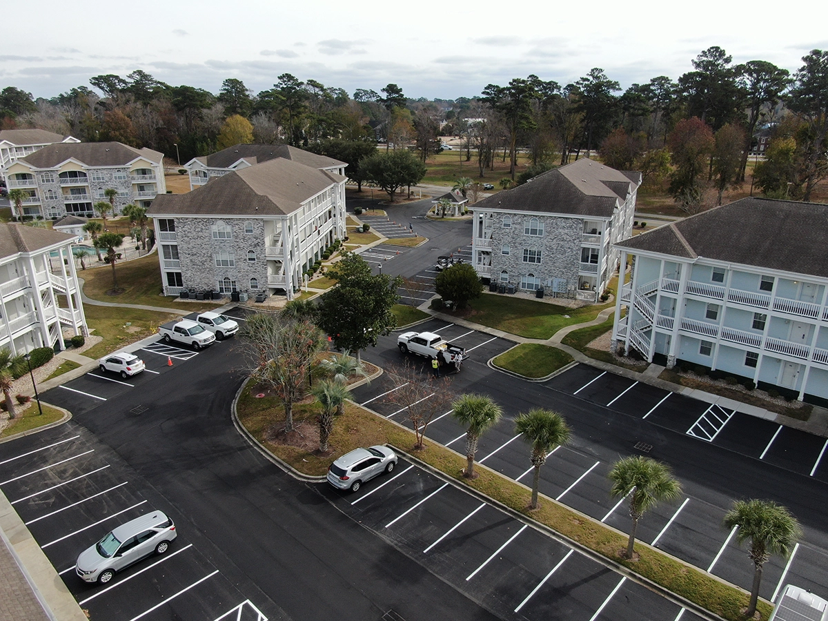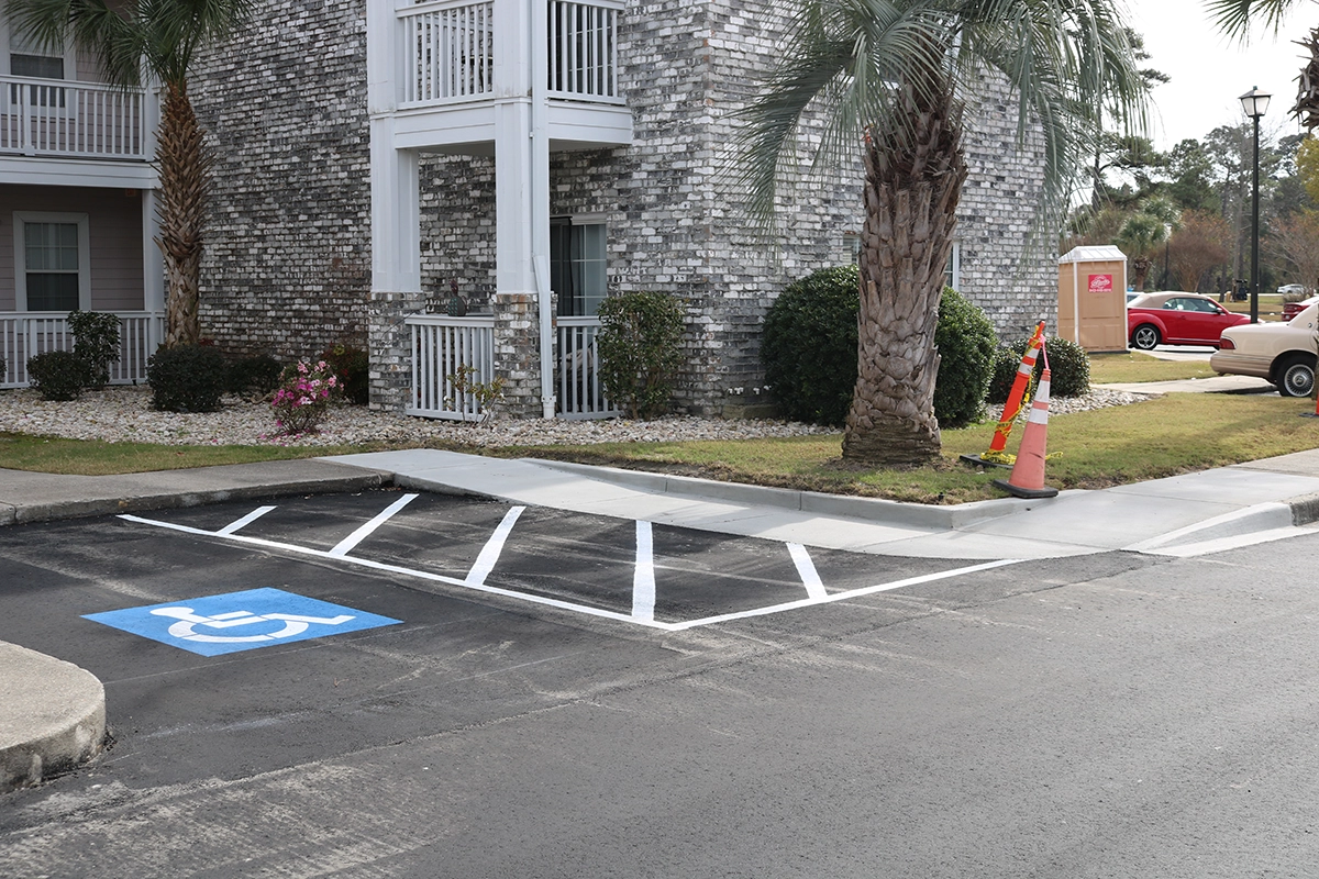 We were able to showcase our total in-house capabilities as a self-performing, full-service contractor on this large condo-style HOA in the Carolina Forest area of Myrtle Beach. With such a significant investment to repave the entire parking lot, we advised the client to take the necessary steps to ensure their investment would last. After conducting core reports and a stormwater assessment of the community’s underground utility system, our team identified multiple areas requiring excavation and stormwater pipe replacement and spot repairs of existing utilities showing damage. While it can be time intensive, proper planning prevents sinkholes and prematurely damaged asphalt. Once stormwater repairs were complete, our concrete crew arrived to repair curbing and sidewalk throughout the community and install 45 (!) ADA-compliant accessibility ramps, removing the existing asphalt ramps that jutted out into the parking areas. Finally, we spent three weeks repaving the entire community in two lifts for a 3” parking lot. This project was completed in the Fall when there was slightly less traffic throughout the HOA. The result – a safe, easily-accessible and beautiful community for residents to enjoy.