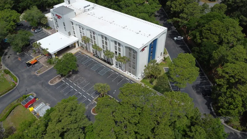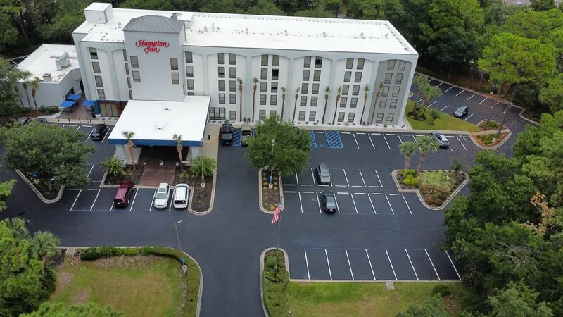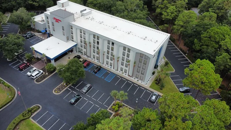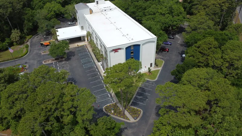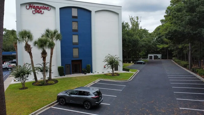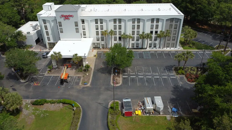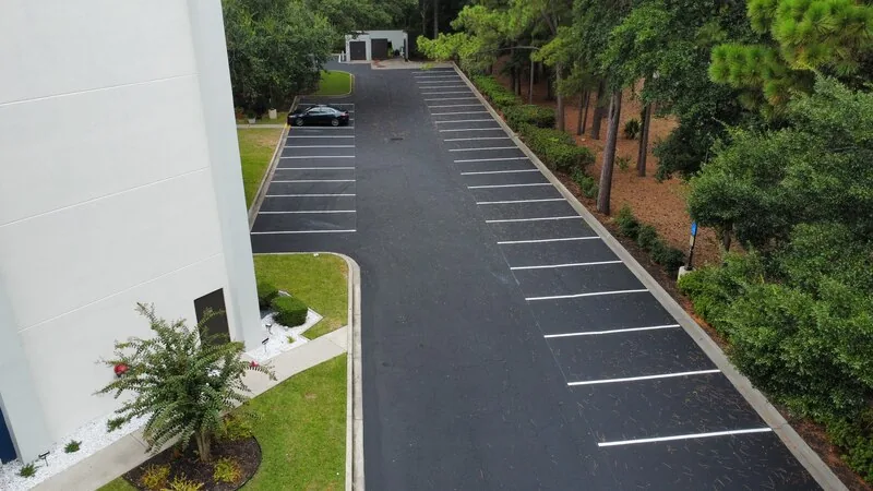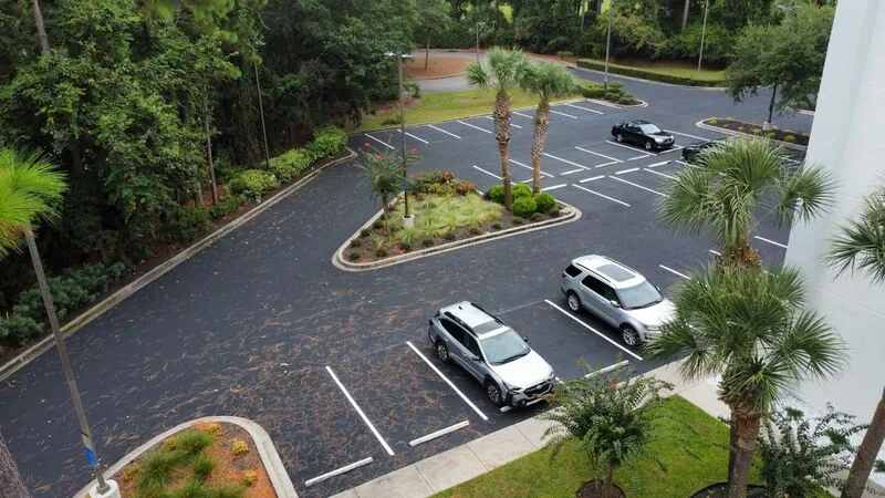 This hotel had recently completed an exterior renovation to give the property a fresh look. But nothing diminishes a months-long renovation project like a tired parking lot. our team showed up within weeks after the renovations were complete to sealcoat and re-stripe the parking lot.